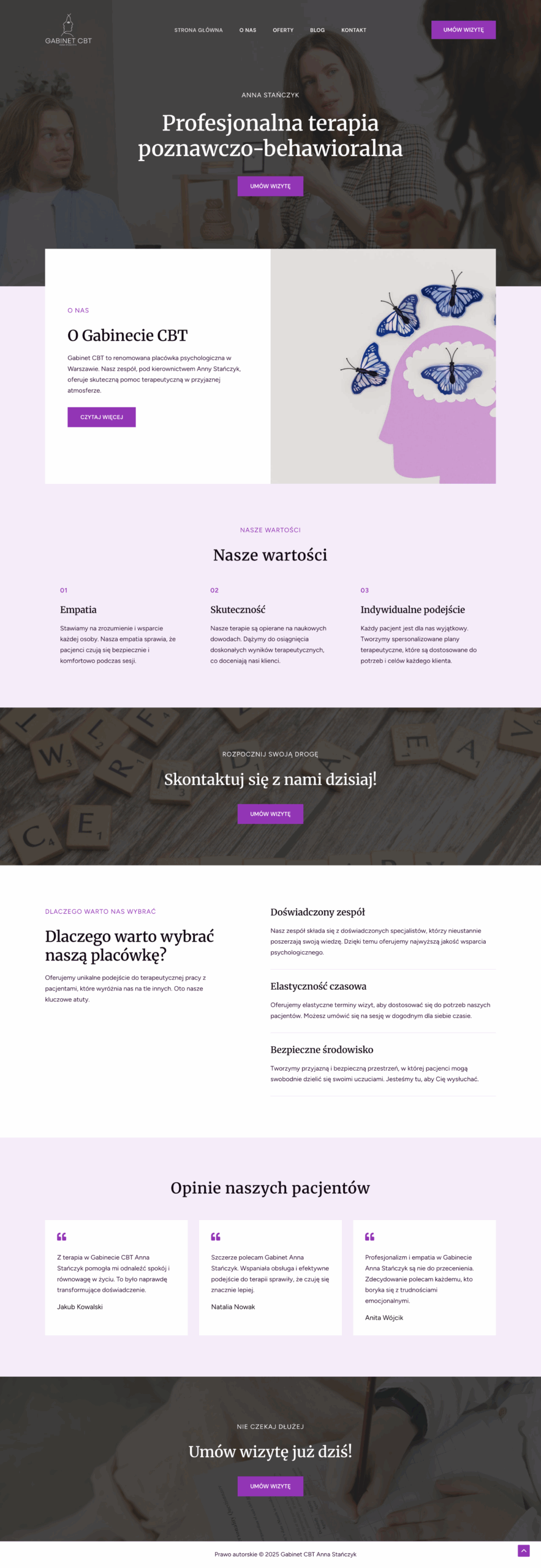 Nowoczesna i empatyczna strona internetowa dla gabinetu oferującego terapię poznawczo-behawioralną. Skupiłem się na spokojnej i przejrzystej estetyce, która wspiera poczucie zaufania i bezpieczeństwa u pacjenta. Projekt podkreśla wartości gabinetu, prezentuje ofertę i umożliwia szybkie umówienie wizyty – wszystko w czytelnej i intuicyjnej formie.